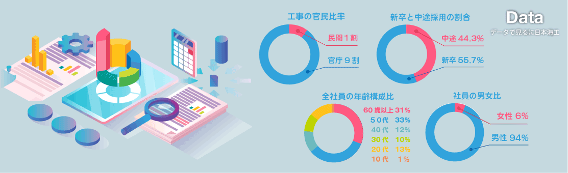 Data データで見る日本海工 「日本海工ってどんな会社?」「どんな人が働いているの?」気になる会社の雰囲気や組織構成を数字でご紹介します! 社内の制度 資格取得支援 産休育休 育児時短制度 退職金制度 クールビズ奨励 有休取得促進 完全週休2日制 財形貯蓄制度 住宅手当・寮 研修制度 社内表彰制度制